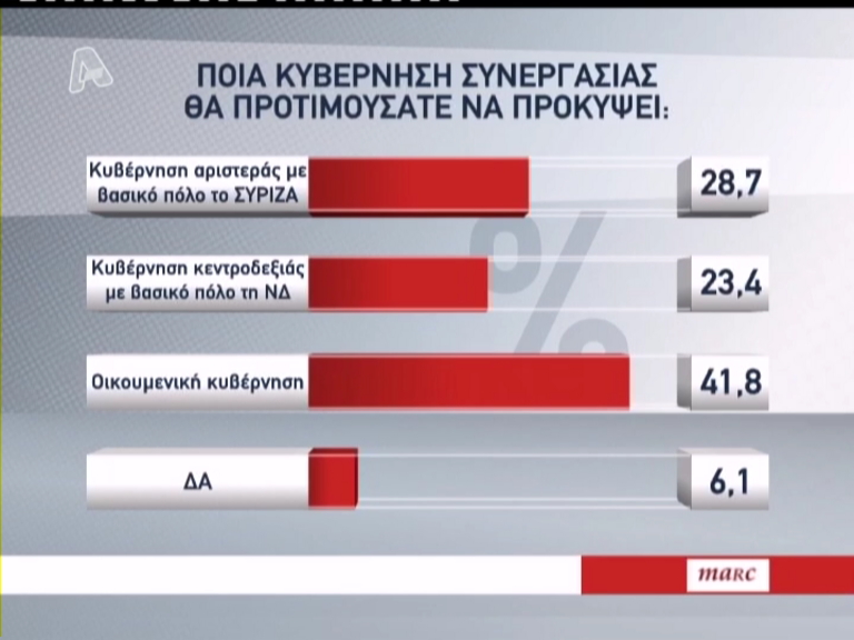 Παράλληλα, το 41,8% των ερωτηθέντων προτιμά οικουμενική κυβέρνηση συνεργασίας, το 28,7% επιλέγει κυβέρνηση αριστεράς με βασικό πόλο τον ΣΥ.ΡΙΖ.Α. και το 23,4% κυβέρνηση κεντροδεξιάς με βασικό πόλο τη ΝΔ.