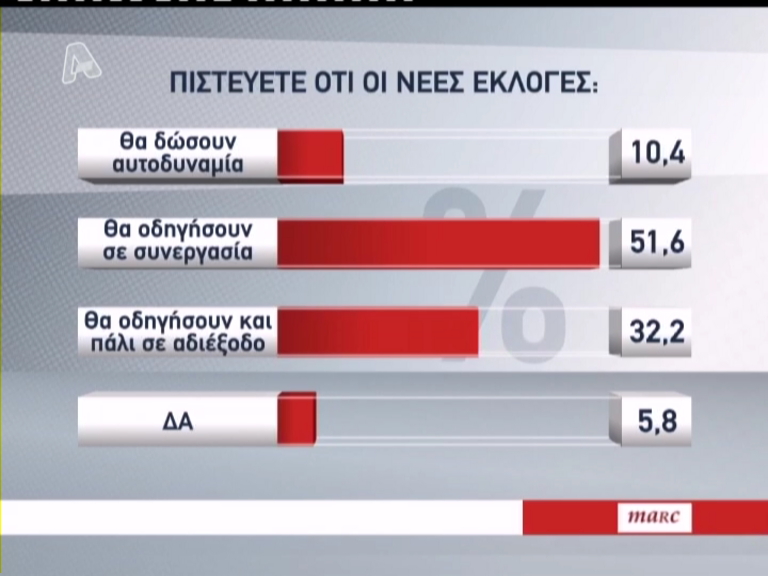 Επίσης, σύμφωνα με τη δημοσκόπηση, το 51,6% των πολιτών πιστεύει ότι οι νέες εκλογές θα οδηγήσουν σε συνεργασία και το 32,2% θεωρεί ότι θα οδηγήσουν και πάλι σε αδιέξοδο. Μόλις το 10,4% των ερωτηθέντων πιστεύει ότι οι επαναληπτικές εκλογές θα δώσουν αυτοδυναμία.