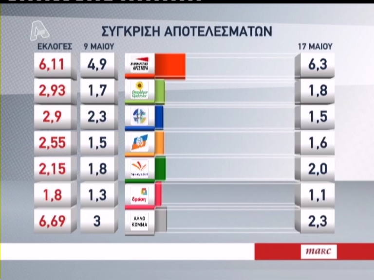 Ενδιαφέρον παρουσιάζει και η σύγκριση των ποσοστών των κομμάτων σε σχέση με τα ποσοστά που συγκέντρωσαν στις εκλογές της 6ης Μαίου, αλλά και στην προηγούμενη δημοσκόπηση της marc για τον ALPHA, αποτυπώνοντας έτσι την απήχηση που είχε στους ψηφοφόρους η στάση κάθε πολιτικής δύναμης μετά τις εκλογές.Συνεχή ανοδική τάση λοιπόν εμφανίζει η ΝΔ, ενώ ο ΣΥ.ΡΙΖ.Α. εμφανίζει αύξηση στα ποσοστά του σε σχέση με τις εκλογές, όμως σημειώνει πτώση 4 μονάδων σε σχέση με την προηγούμενη δημοσκόπηση της marc που έγινε τρεις ημέρες μετά τις εκλογές.Μικρή άνοδος παρατηρείται στα ποσοστά του ΠΑΣΟΚ, και της ΔΗΜ.ΑΡ σε σύγκριση με τα ποσοστά τους στις εκλογές. Ενώ, σημαντική είναι η πτώση στα ποσοστά των Ανεξάρτητων Ελλήνων, του ΚΚΕ και της Χρυσής Αυγής, με τα ποσοστά των τριών κομμάτων αυτών να μειώνονται σταδιακά σε σχέση με τις εκλογές της 6ης Μαίου.