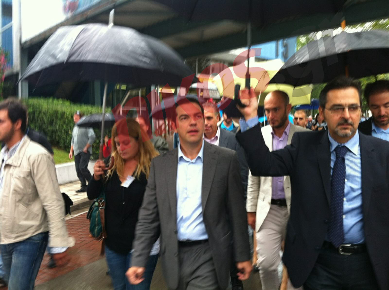 Απορροφημένος στις σκέψεις του ο Αλέξης Τσίπρας χθες στη διάρκεια της βόλτας του στα περίπτερα της ΔΕΘ. Τόσο απορροφημένος, που ενώ είχε ήδη αρχίσει να πέφτει η βροχή, ο πρόεδρος του ΣΥΡΙΖΑ παρέμεινε σκυφτός και με τα χέρια στις τσέπες.Δεν σκέφτηκε καν να ανοίξει μια ομπρέλα, ωστόσο φρόντισαν γι’ αυτό οι συνοδοί του, μία από τους οποίους γένους θηλυκού.