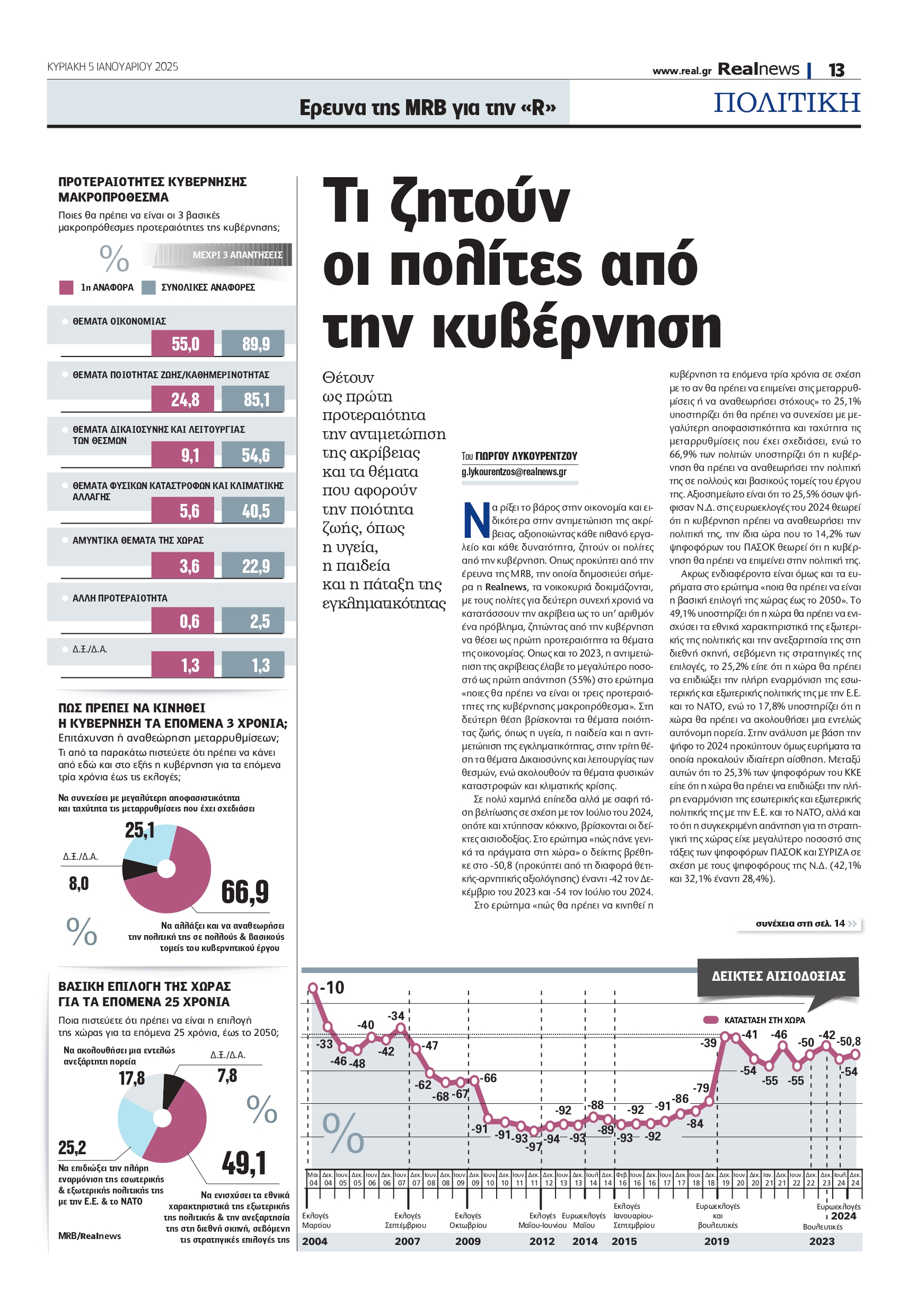 Το 55% των πολιτών θεωρεί την ακρίβεια ως τη μεγαλύτερη απειλή. Στη δεύτερη θέση βρίσκονται τα θέματα ποιότητας ζωής, όπως η υγεία, η παιδεία και η αντιμετώπιση της εγκληματικότητας, και στην τρίτη τα θέματα Δικαιοσύνης και λειτουργίας των θεσμών. Η κοινή γνώμη θεωρεί ότι πρωταγωνιστής το 2025 θα είναι ο Κυριάκος Μητσοτάκης. Η αξιολόγηση της εκλογής Τραμπ και το νέο πλαίσιο των ελληνοαμερικανικών σχέσεων.