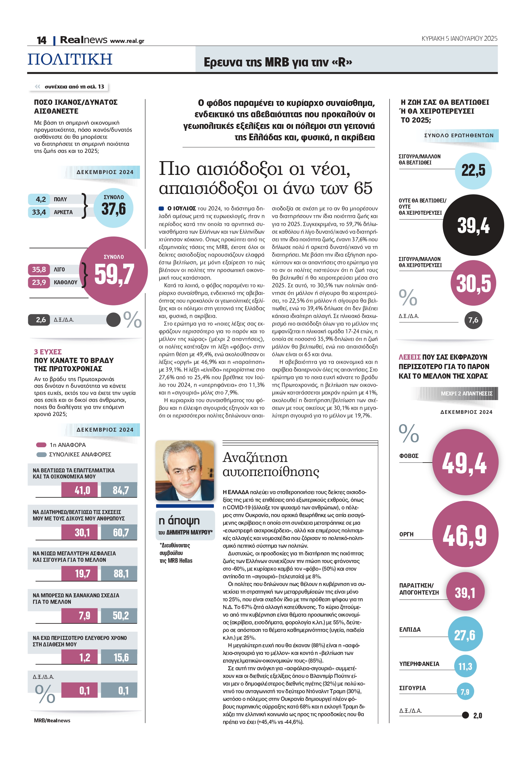 Ο φόβος παραμένει το κυρίαρχο συναίσθημα, ενδεικτικό της αβεβαιότητας που προκαλούν οι γεωπολιτικές εξελίξεις και οι πόλεμοι στη γειτονιά της Ελλάδας και, φυσικά, η ακρίβεια.