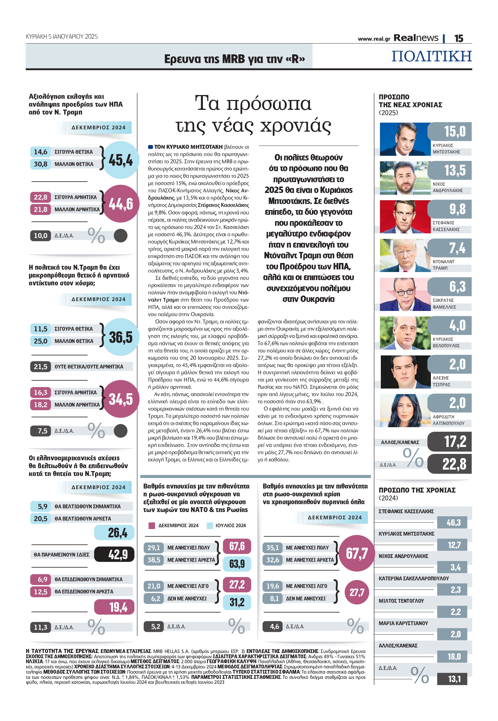 Οι πολίτες θεωρούν ότι το πρόσωπο που θα πρωταγωνιστήσει το 2025 θα είναι ο Κυριάκος Μητσοτάκης. Σε διεθνές επίπεδο, τα δύο γεγονότα που προκάλεσαν το μεγαλύτερο ενδιαφέρον ήταν η επανεκλογή του Ντόναλντ Τραμπ στη θέση του Προέδρου των ΗΠΑ, αλλά και οι επιπτώσεις του συνεχιζόμενου πολέμου στην Ουκρανία.