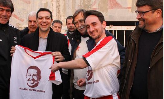 Με τη φανέλα να γράφει «Ο Τσάβες πέρασε από εδώ», ο Αλέξης Τσίπρας ποζάρει ανάμεσα σε παλαίμαχους ποδοσφαιριστές.