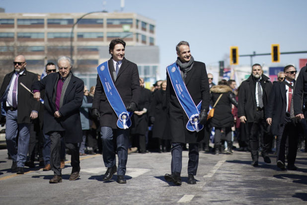 Ο πρωθυπουργός Κυριάκος Μητσοτάκης, στο πλαίσιο της επίσημης επίσκεψής του στον Καναδά, παρακολούθησε την παρέλαση συλλόγων της Ελληνικής Κοινότητας Μείζονος Μόντρεαλ για την εθνική εορτή της 25ης Μαρτίου, μαζί με τον Καναδό ομόλογό του Τζάστιν Τριντό.