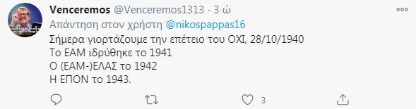 Ο πρώην σύμβουλος του Αλέξη Τσίπρα, με ανάρτησή του στο twitter, απευθύνθηκε σε όσους γιορτάζουν την 28η Οκτωβρίου και το έπος του 1940, γράφοντας: «Φασίστες, ρουφιάνοι, δοσίλογοι, ταγματασφαλίτες, ακροδεξιοί, τα κεφάλια μέσα και σκασμό. Σήμερα η μνήμη εκδικείται και τιμάει ηρωίδες και ήρωες. Τιμάμε τον αντιστασιακό λαό, την Εθνική Αντίσταση». Την ανάρτηση συνόδευσε με μία εικόνα από τη σημαία του ΕΑΜ-ΕΛΑΣ.