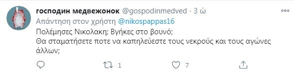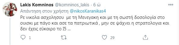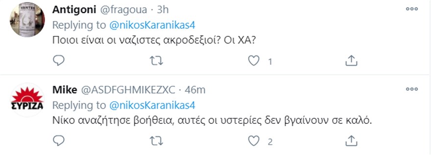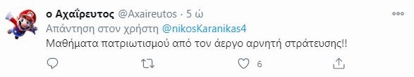 Η ανάρτηση πολύ γρήγορα προκάλεσε αντιδράσεις, με τον Νίκο Καρανίκα, να προχωράει σε νέα ανάρτηση, στην οποία έγραψε: “Διαβάζει ο κόσμος τον όρκο των ηρώων μας που μας απελευθέρωσαν διαβάζει και των υπόδουλων παπούδων σας ακροδεξιοί και φασίστες και κρίνει για την σημερινή κατάντια σας”.