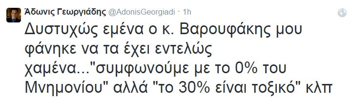 «Δυστυχώς εμένα ο κ. Βαρουφάκης μου φάνηκε να τα έχει εντελώς χαμένα…” συμφωνούμε με το 0% του Μνημονίου” αλλά “το 30% είναι τοξικό” κλπ», έγραψε ο κ. Γεωργιάδης.