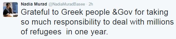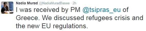Από την πλευρά της η Νάντια Μουράντ Μπασε έγραψε στον δικό της λογαριασμό ότι έγινε δεκτή από τον Πρωθυπουργό, με τον οποίο συζήτησαν για την προσφυγική κρίση και τους νέους κανονισμούς της ΕΕ.