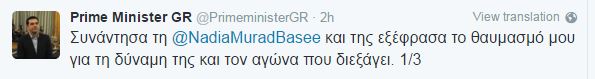 Με ανάρτηση στον λογαριασμό του στο twitter o κ. Τσίπρας σημείωσε ότι εξέφρασε στην ακτιβίστρια τον θαυμασμό του για τη δύναμη της και τον αγώνα που διεξάγει και πρόσθεσε ότι ο πόλεμος και ο θρησκευτικός φανατισμός, καταστρέφουν τις κοινωνικές δομές στη Συρία και ωθούν εκατομμύρια ανθρώπους στην προσφυγιά.
