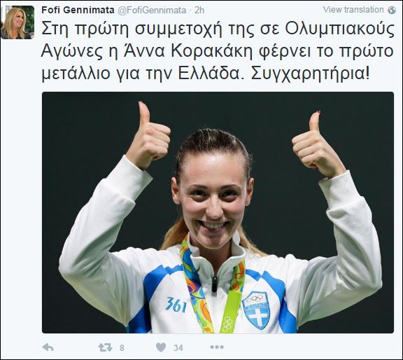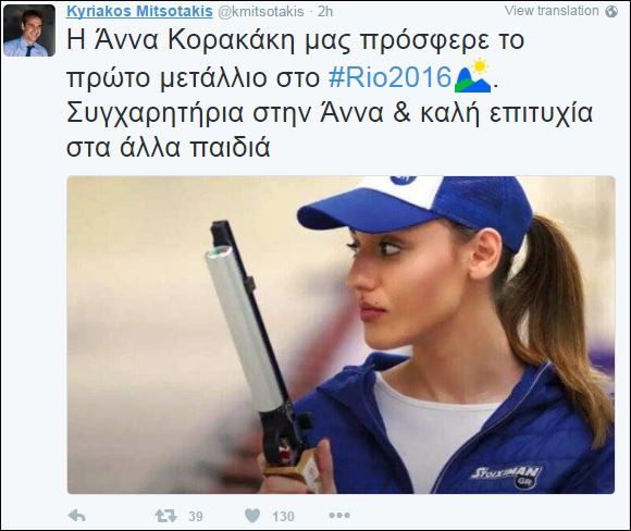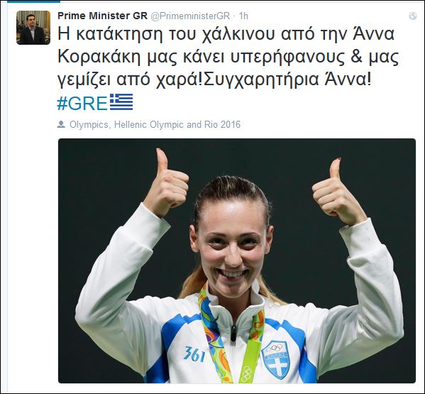 Οι πολιτικοί αρχηγοί έσπευσαν να συγχαρούν μέσω Twitter την Άννα Κορακάκη, η οποία έφερε το πρώτο μετάλλιο για την Ελλάδα στους φετινούς Ολυμπιακούς Αγώνες του Ρίο, στο άθλημα της σκοποβολής.