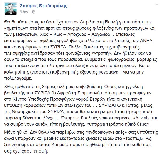 «Η βουλευτής του ΣΥΡΙΖΑ στο Νομό Σερρών, κυρία Αφροδίτη Σταμπουλή, καταγγέλλει το μέλος της τοπικής Νομαρχιακής του ΣΥΡΙΖΑ κ. Δημήτριο Τάπα ότι, μαζί με την κόρη του – συντονίστρια του χώρου φιλοξενίας – έχουν αναλάβει έργο σίτισης προσφύγων, ύψους 750.000 ευρώ.