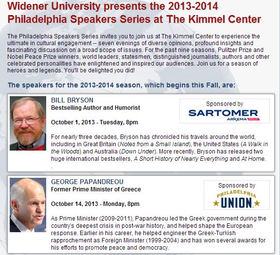 Την περασμένη Τετάρτη, 9 Οκτωβρίου, ο Γιώργος Παπανδρέου μίλησε στο Heinz Hall στο πλαίσιο του Pittsburgh Speakers Series του Robert Morris University, ενώ σήμερα 14 Οκτωβρίου θα συμμετάσχει στο «Speakers Series» του Widener University στη Φιλαδέλφεια. Ακολουθούν ανάλογες εκδηλώσεις των Stevenson University και Lesley University, σε Βαλτιμόρη και Βοστόνη αντίστοιχα, στις 15 και 16 Οκτωβρίου.