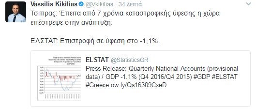 Ο κ. Κικίλιας στην ανάρτησή του, παραθέτει και την ανακοίνωση της ΕΛΣΤΑΤ όπου γίνεται λόγος για επιστροφή στην ύφεση -1,1%, σχολιάζοντας με αυτό τον τρόπο τη δήλωση του Πρωθυπουργού πως «έπειτα από 7 χρόνια καταστροφικής ύφεσης η χώρα επέστρεψε στην ανάπτυξη».