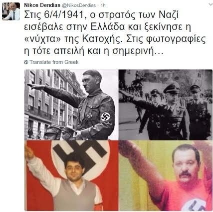 Ο κοινοβουλευτικός εκπρόσωπος της ΝΔ, Νίκος Δένδιας με ανάρτησή του στο twitter, υπενθυμίζει ότι σαν σήμερα, στις 6 Απριλίου 1941, ο στρατός της ναζιστικής Γερμανίας εισέβαλε στην Ελλάδα, κάνοντας έναν παραλληλισμό με το σήμερα και τη Χρυσή Αυγή. «Στις 6/4/1941, ο στρατός των Ναζί εισέβαλε στην Ελλάδα και ξεκίνησε η «νύχτα» της Κατοχής. Στις φωτογραφίες η τότε απειλή και η σημερινή» έγραψε ο κ. Δένδιας ανεβάζοντας τέσσερις φωτογραφίες.