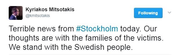Μήνυμα στήριξης στον σουηδικό λαό, έστειλε μέσω του προσωπικού του λογαριασμού στο Twitter ο πρόεδρος της Νέας Δημοκρατίας Κυριάκος Μητσοτάκης.Ο κ. Μητσοτάκης έγραψε: «Φρικτά νέα από τη Στοκχόλμη. Οι σκέψεις μας είναι με τις οικογένειες των θυμάτων, Συμπαραστεκόμαστε στον σουηδικό λαό».