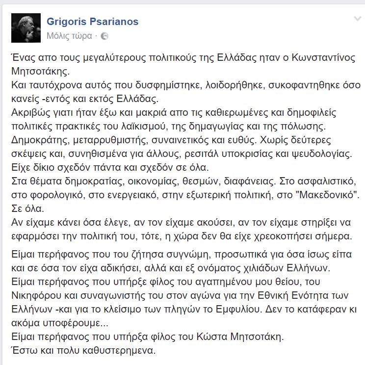 Με ανάρτησή του στην προσωπική του σελίδα στο Facebook, ο Γρηγόρης Ψαριανός έπλεξε το εγκώμιο του Κωνσταντίνου Μητσοτάκη. Συγκεκριμένα ο βουλευτής του Ποταμιού αναφερόμενος στον πρώην πρωθυπουργό, ο οποίος άφησε την τελευταία του πνοή τα ξημερώματα της Δευτέρας, τόνισε μεταξύ άλλων: