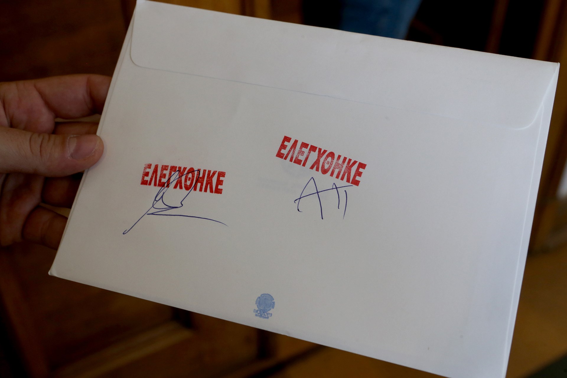 Στη φωτογραφία του ΑΠΕ-ΜΠΕ απεικονίζεται ένας φάκελος αλληλογραφίας στη Βουλή, ο οποίος έχει περάσει από διπλό έλεγχο.