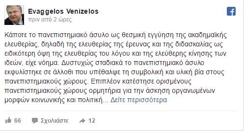 Με ανάρτηση στη προσωπική του σελίδα στο Facebook, ο Ευάγγελος Βενιζέλος εξέφρασε τη διαφωνία του με τις προτάσεις του υπουργείου Παιδείας για την τριτοβάθμια εκπαίδευση.