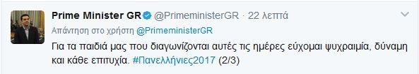 “Οι Πανελλαδικές Εξετάσεις είναι μία πολύ σημαντική στιγμή στη ζωή, όχι όμως αυτή που κρίνει τα πάντα”, αναφέρει, μεταξύ άλλων ο Πρωθυπουργός Αλέξης Τσίπρας, με μήνυμά του στο twitter, αναφερόμενος στην έναρξη των Πανελλαδικών εξετάσεων και συμπληρώνει: “Για τα παιδιά μας που διαγωνίζονται αυτές τις ημέρες εύχομαι ψυχραιμία, δύναμη και κάθε επιτυχία”.