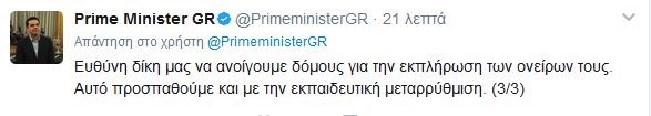 “Ευθύνη δίκη μας να ανοίγουμε δρόμους για την εκπλήρωση των ονείρων τους. Αυτό προσπαθούμε και με την εκπαιδευτική μεταρρύθμιση”, σημειώνει τέλος ο Αλέξης Τσίπρας.