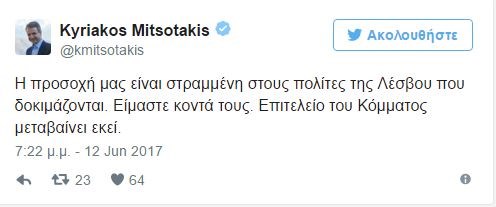 Ο πρόεδρος της ΝΔ Κυριάκος Μητσοτάκης έκανε την εξής ανάρτηση στο twitter: «Η προσοχή μας είναι στραμμένη στους πολίτες της Λέσβου που δοκιμάζονται. Είμαστε κοντά τους. Επιτελείο του κόμματος μεταβαίνει εκεί».
