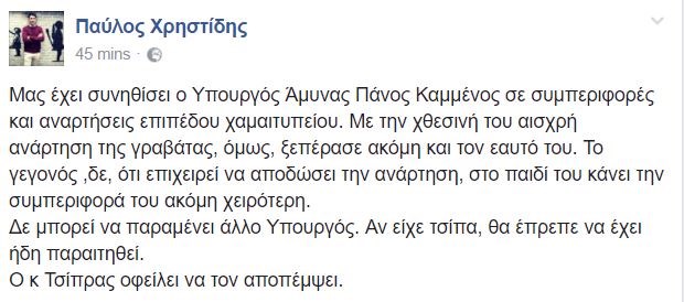 Με ανάρτησή του στο Facebook, o εκπρόσωπος Τύπου του ΠΑΣΟΚ, Παύλος Χρηστίδης ζητά την αποπομπή του υπουργού Εθνικής Άμυνας Πάνου Καμμένου με αφορμή τη χθεσινή ανάρτηση που έγινε στον λογαριασμό του κ. Καμμένου στο twitter.