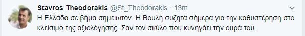 “Η Ελλάδα σε βήμα σημειωτόν. Η Βουλή συζητά σήμερα για την καθυστέρηση στο κλείσιμο της αξιολόγησης. Σαν τον σκύλο που κυνηγάει την ουρά του” έγραψε στο twitter o κ. Θεοδωράκης.