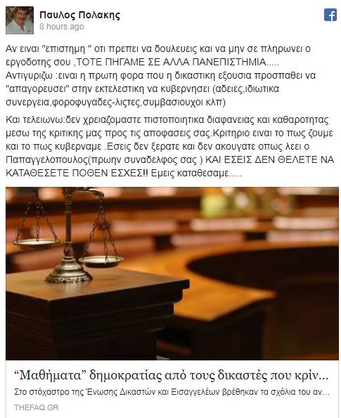 «Είναι η πρώτη φορά που η δικαστική εξουσία προσπαθεί να “απαγορεύσει” στην εκτελεστική να κυβερνήσει», αναφέρει μεταξύ άλλων ο κ. Πολάκης. Αναλυτικά η ανάρτησή του: «Αν είναι “επιστήμη” ότι πρέπει να δουλεύεις και να μην σε πληρώνει ο εργοδότης σου, ΤΟΤΕ ΠΗΓΑΜΕ ΣΕ ΑΛΛΑ ΠΑΝΕΠΙΣΤΗΜΙΑ….. Αντιγυρίζω: Είναι η πρώτη φορά που η δικαστική εξουσία προσπαθεί να “απαγορεύσει” στην εκτελεστική να κυβερνήσει (άδειες, ιδιωτικά συνεργεία, φοροφυγάδες-λίστες, συμβασιούχοι κ.λπ.) Και τελειώνω:δεν χρειαζόμαστε πιστοποιητικά διαφάνειας και καθαρότητας μέσω της κριτικής μας προς τις αποφάσεις σας. Κριτήριο είναι το πως ζούμε και το πως κυβερνάμε. Εσείς δεν ξέρατε και δεν ακούγατε όπως λέει ο Παπαγγελόπουλος (πρώην συνάδελφος σας) ΚΑΙ ΕΣΕΙΣ ΔΕΝ ΘΕΛΕΤΕ ΝΑ ΚΑΤΑΘΕΣΕΤΕ ΠΟΘΕΝ ΕΣΧΕΣ!! Εμείς καταθέσαμε……»