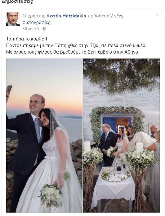 “Το πήρα το κορίτσι! Παντρευτήκαμε με την Πόπη χθες στην Τζιά, σε πολύ στενό κύκλο. Με όλους τους φίλους θα βρεθούμε το Σεπτέμβριο στην Αθήνα.”, έγραψε ο Κωστής Χατζηδάκης που ανέβασε τις φωτογραφίες από τον γάμο του στη σελίδα του στο Facebook.