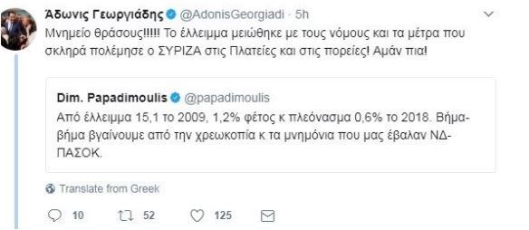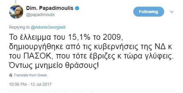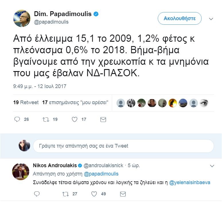 «Φωτιές» άναψε ένα tweet του αντιπροέδρου του Ευρωκοινοβουλίου και ευρωβουλευτή του ΣΥΡΙΖΑ, Δημήτρη Παπαδημούλη, σχετικά με το έλλειμμα.«Από έλλειμμα 15,1 το 2009, 1,2% φέτος και πλεόνασμα 0,6% το 2018. Βήμα-βήμα βγαίνουμε από την χρεοκοπία κ τα μνημόνια που μας έβαλαν ΝΔ-ΠΑΣΟΚ», έγραψε ο κ. Παπαδημούλης, προκαλώντας καυστικά σχόλια από στελέχη άλλων κομμάτων.Ο αντιπρόεδρος της ΝΔ, Άδωνις Γεωργιάδης, έγραψε χαρακτηριστικά στον προσωπικό του λογαριασμό στο twitter: «Μνημείο θράσους!! Το έλλειμμα μειώθηκε με τους νόμους και τα μέτρα που σκληρά πολέμησε ο ΣΥΡΙΖΑ στις πλατείες και στις πορείες. Αμάν πια!!». Ο ευρωβουλευτής του ΣΥΡΙΖΑ απάντησε στον κ. Γεωργιάδη λέγοντας ότι «Το έλλειμμα του 15,1% το 2009, δημιουργήθηκε από τις κυβερνήσεις της ΝΔ και του ΠΑΣΟΚ που τότε έβριζες και τώρα γλύφεις. Όντως μνημείο θράσους!».
