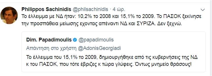 «Το έλλειμμα με ΝΔ ήταν: 10,2% το 2008 και 15,1% το 2009. Το ΠΑΣΟΚ ξεκίνησε την προσπάθεια μείωσης έχοντας απέναντι ΝΔ και ΣΥΡΙΖΑ. Δεν ξεχνώ», έγραψε χαρακτηριστικά από την πλευρά του ο πρώην υπουργός Οικονομικών και στέλεχος του Κινήματος Δημοκρατών Σοσιαλιστών, Φίλιππος Σαχινίδης.