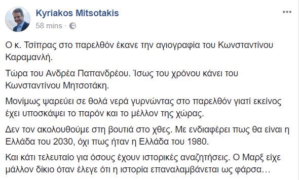 “Και κάτι τελευταίο για όσους έχουν ιστορικές αναζητήσεις. Ο Μαρξ είχε μάλλον δίκιο όταν έλεγε ότι η ιστορία επαναλαμβάνεται ως φάρσα…” καταλήγει ο πρόεδρος της ΝΔ.