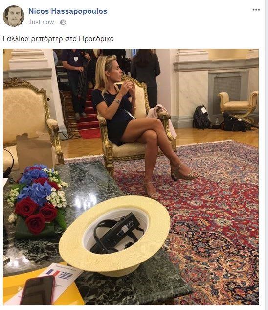 Μια Γαλλίδα δημοσιογράφος συγκέντρωσε τα ανδρικά βλέμματα κατά τη διάρκεια της επίσκεψης του Εμανουέλ Μακρόν στο Προεδρικό Μέγαρο. Όπως θα διαπιστώσετε και στην φωτογραφία αυτό ήταν απόλυτα δικαιολογημένο, καθώς η ξανθιά ρεπόρτερ φορούσε ένα μαύρο μίνι φόρεμα που αναδείκνυε τα καλλίγραμμα πόδια της. Την φωτογραφία ανέβασε στον προσωπικό του λογαριασμό στο Facebook ο δημοσιογράφος Νίκος Χασαπόπουλος.