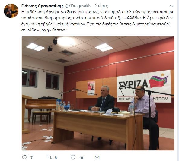 Η εκδήλωση της Ν.Ε. Ανατολικής Αθήνας και Ο.Μ. Δάφνης-Υμηττού του ΣΥΡΙΖΑ ξεκίνησε με καθυστέρηση γιατί ομάδα πολιτών ανάρτησε πανό και πέταξε φυλλάδια, όπως έγραψε στον λογαριασμό του στο Twitter ο αντιπρόεδρος της κυβέρνησης.
