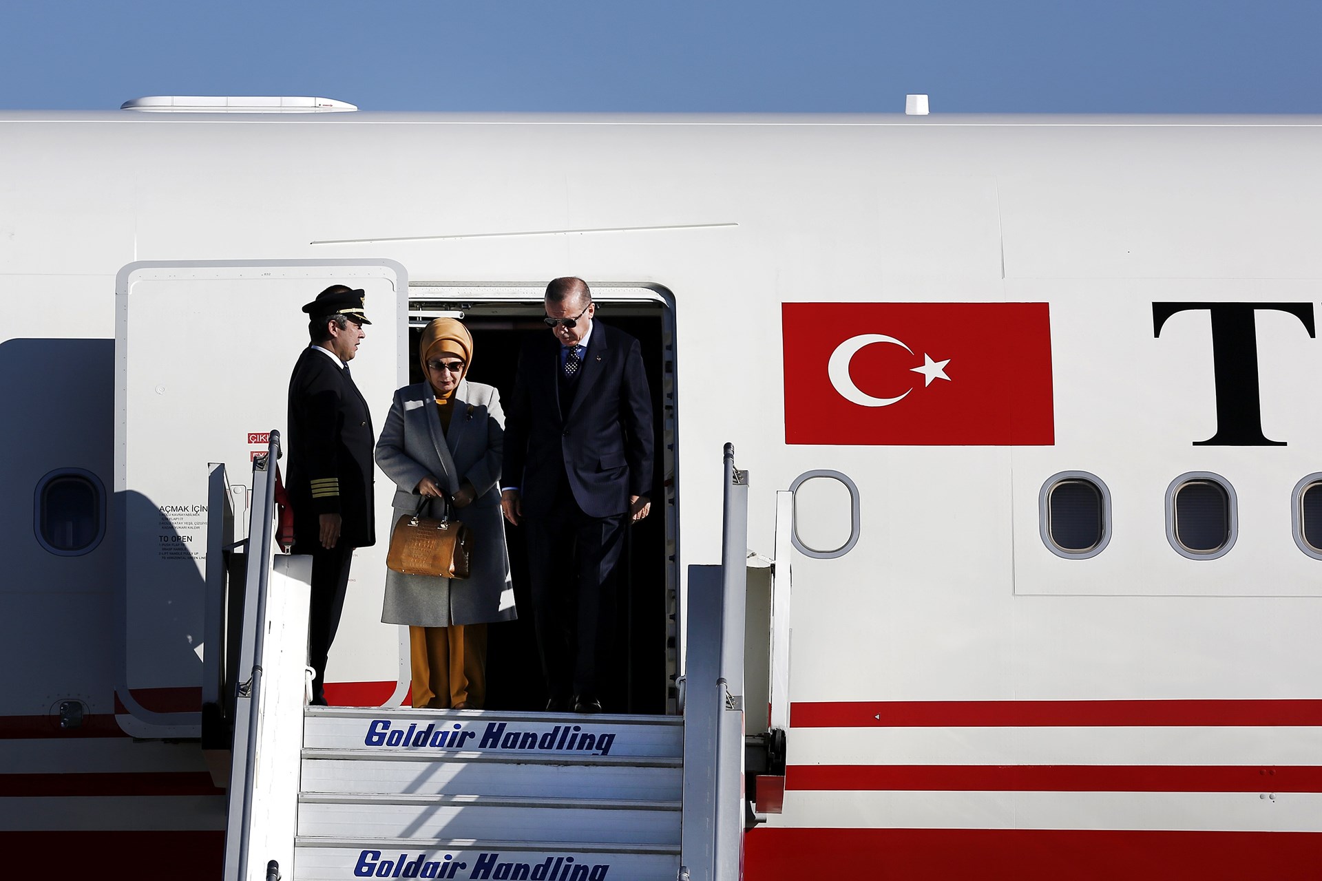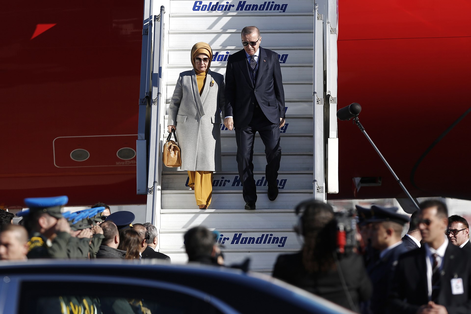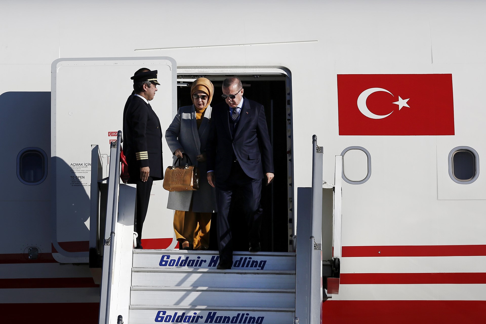Ο Πρόεδρος της Τουρκίας Ρετζέπ Ταγίπ Ερντογάν και η σύζυγος του Εμινέ Ερντογάν κατέβηκαν από το αεροσκάφος πιασμένοι χέρι με χέρι.