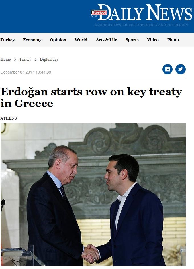 Η «Daily Sabah» φιλοξενεί δημοσίευμα με τον τίτλο: «Η Συνθήκη της Λωζάννης χρήζει αναθεώρησης για τους Τούρκους στην Ελλάδα, λέει ο Ερντογάν κατά την επίσκεψή του στην Αθήν». Στο ίδιο δημοσίευμα φιλοξενούνται και δηλώσεις του Έλληνα Προέδρου της Δημοκρατίας, Προκόπη Παυλόπουλου, ο οποίος ανέφερε πως «η Συνθήκη της Λωζάννης δεν χρειάζεται ούτε αναθεώρηση, ούτε επικαιροποίηση».