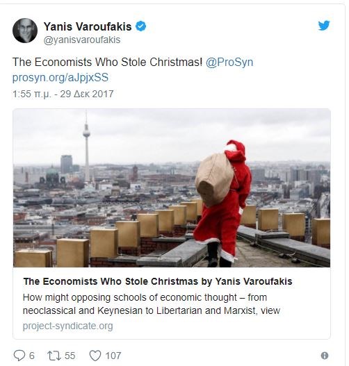 Συγκεκριμένα, ο κ. Βαρουφάκης γράφει στο “project-syndicate.org” ένα ιδιαίτερο αφιέρωμα στη σχέση των Χριστουγέννων με τις διάφορες οικονομικές σχολές. Στο κείμενο που τιτλοφορείται «οι οικονομολόγοι που έκλεψαν τα Χριστούγεννα» ο Γιάνης Βαρουφάκης αναφέρεται στο πώς η κάθε σχολή σκέψης αντιλαμβάνεται τις γιορτές των Χριστουγέννων και συγκεκριμένα την παράδοση της ανταλλαγής δώρων.