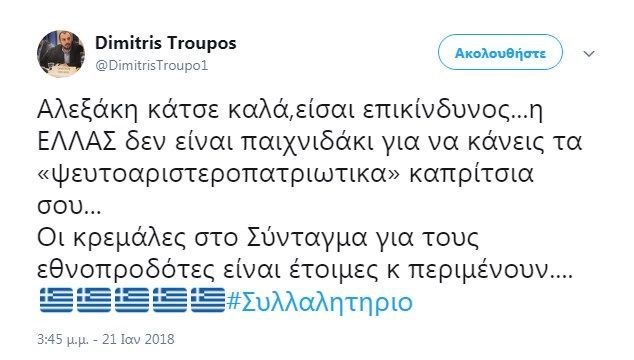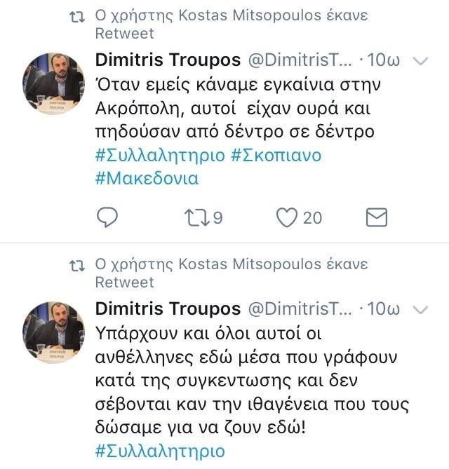 Αναμένουμε από τον πρόεδρο της Νέας Δημοκρατίας, Κυρ. Μητσοτάκη, να αποπέμψει τον Δ. Τρούπο από τη νεολαία του κόμματος του” αναφέρεται στην ανακοίνωση του ΣΥΡΙΖΑ.Οι αναρτήσεις που φέρεται να έχει κάνει ο Δημήτρης Τρούπος στο Twitter και κάνουν τον γύρο του διαδικτύου είναι οι παρακάτω. Ωστόσο, ο συγκεκριμένος λογαριασμός δεν υπάρχει πλέον στο Twitter.
