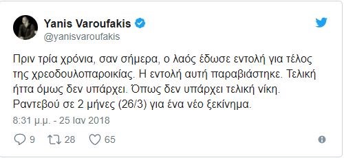 «Πριν τρία χρόνια, σαν σήμερα, ο λαός έδωσε εντολή για τέλος της χρεοδουλοπαροικίας. Η εντολή αυτή παραβιάστηκε. Τελική ήττα όμως δεν υπάρχει. Όπως δεν υπάρχει τελική νίκη. Ραντεβού σε 2 μήνες (26/3) για ένα νέο ξεκίνημα» έγραψε χαρακτηριστικά.Δείτε το tweet: