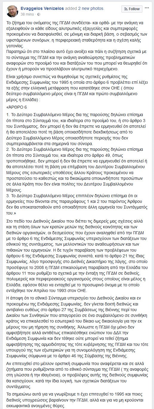 Παρέμβαση στο θέμα της ονομασίας των Σκοπίων και της αναθεώρησης του Συντάγματος της πΓΔΜ έκανε μέσω ανάρτησής στο Facebook ο πρώην πρόεδρος του ΠΑΣΟΚ και αντιπρόεδρος της κυβέρνησης Σαμαρά Ευάγγελος Βενιζέλος.