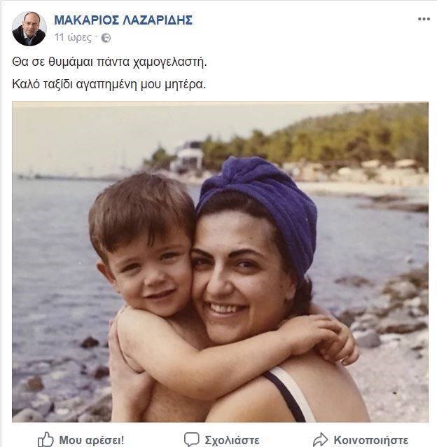 Με μία συγκινητική ανάρτηση στο Facebook, ο δημοσιογράφος και σύμβουλος επικοινωνίας του προέδρου της Νέας Δημοκρατίας, Μακάριος Λαζαρίδης, αποχαιρέτισε την μητέρα του Γεωργία που έφυγε χθες από τη ζωή. Ο κ. Λαζαρίδης ανάρτησε μία φωτογραφία από την παιδική του ηλικία, στην αγκαλιά της μητέρας του. «Θα σε θυμάμαι πάντα χαμογελαστή. Καλό ταξίδι, αγαπημένη μου μητέρα», έγραψε.