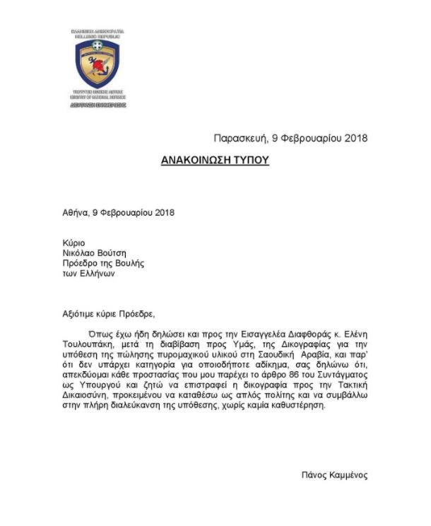 Ο κ. Καμμένος επικοινώνησε το πρωί με τον Πρόεδρο της Βουλής, Νίκο Βούτση για το θέμα και το απόγευμα του απέστειλε την επιστολή με την οποία απεκδύεται κάθε προστασίας και ασυλίας του άρθρου 86 για την ευθύνη υπουργών και ότι διατίθεται να καταθέσει ως απλός πολίτης για την άμεση και πλήρη διαλεύκανση της υπόθεσης. Δείτε τη φωτογραφία: