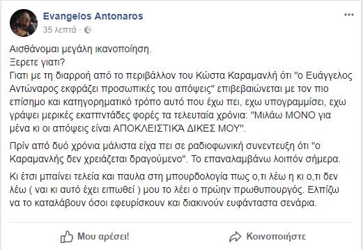 Με μεγάλη ικανοποίηση, όπως ανέφερε σε ανάρτησή του στο Facebook, υποδέχθηκε την τοποθέτηση συνομιλητών του πρώην Πρωθυπουργού, Κώστα Καραμανλή πως «εκφράζει μόνο προσωπικές του απόψεις» ο Ευάγγελος Αντώναρος.