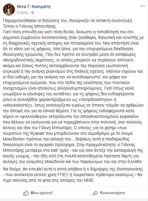 Επίθεση κατά του δημάρχου Θεσσαλονίκης Γιάννη Μπουτάρη, εξαπέλυσε η βουλευτής του ΣΥΡΙΖΑ Νίνα Κασιμάτη, για τις δηλώσεις του σχετικά με το ζήτημα της ονομασίας των Σκοπίων.