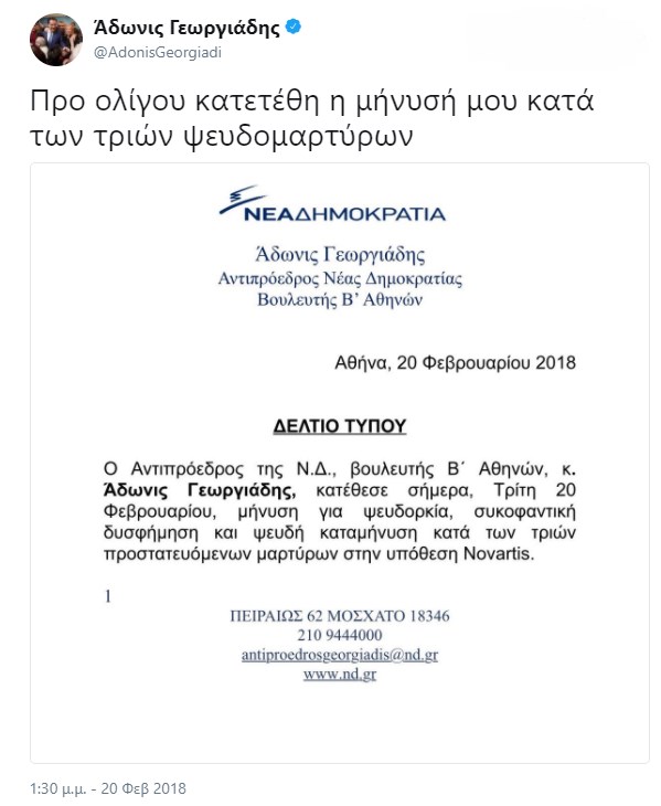 Ο Αντιπρόεδρος της ΝΔ, Άδωνις Γεωργιάδης, κατέθεσε μήνυση κατά των προστατευόμενων μαρτύρων. Όπως ανακοίνωσε ο ίδιος μέσω του λογαριασμού του στο twitter η μήνυσή του κατά των τριών «ψευδομαρτύρων», όπως τους χαρακτηρίζει, είναι για ψευδορκία, συκοφαντική δυσφήμιση και ψευδή καταμήνυση.