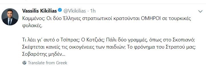 Συγκεκριμένα, έγραψε τα εξής: «Καμμένος: Οι δύο Έλληνες στρατιωτικοί κρατούνται ΟΜΗΡΟΙ σε τουρκικές φυλακές. Τι λέει γι αυτό ο Τσίπρας; Ο Κοτζιάς; Πάλι δύο γραμμές, όπως στο Σκοπιανό; Σκέφτεται κανείς τις οικογένειες των παιδιών; Το φρόνημα του Στρατού μας; Σοβαρότης μηδέν…».