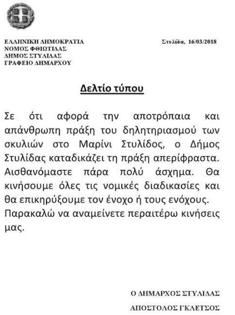 Η είδηση ότι άγνωστοι δηλητηρίασαν με φόλες σκύλους στον οικισμό Μαρίνι στη Στυλίδα, έβγαλε από τα “ρούχα” του τον δήμαρχο Στυλίδας, Απόστολο Γκλέτσο.
