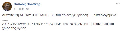Ο αναπληρωτής υπουργός Υγείας, Παύλος Πολάκης, απάντησε μέσω του λογαριασμού του στο facebook, αναφορικά με τη συνέντευξη τύπου που έδωσε ο αντιπρόεδρος της ΝΔ, Άδωνις Γεωργιάδης.