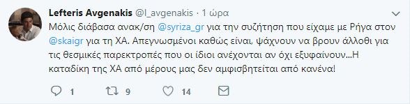 Μόλις διάβασα ανακ/ση @syriza_gr για την συζήτηση που είχαμε με Ρήγα στον @skaigr για τη ΧΑ. Απεγνωσμένοι καθώς είναι, ψάχνουν να βρουν άλλοθι για τις θεσμικές παρεκτροπές που οι ίδιοι ανέχονται αν όχι εξυφαίνουν…Η καταδίκη της ΧΑ από μέρους μας δεν αμφισβητείται από κανένα!